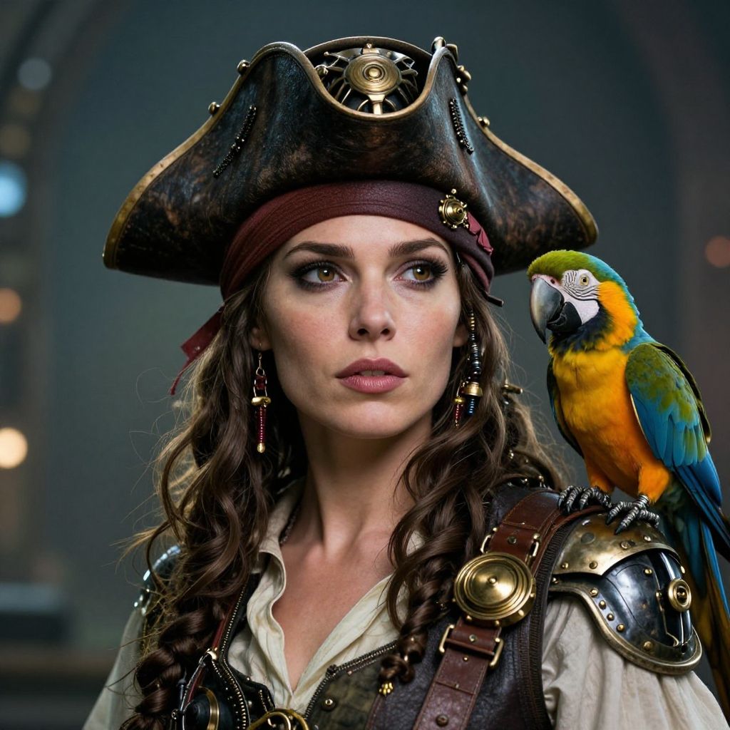 ((masterpiece, best quality, highres, realistic)) Perfect Face, score_9, score_8_up, score_7_up, 1 pirate woman, steampunk, futurism, the world of the future, parrot robot on the shoulder, beautiful cosposition