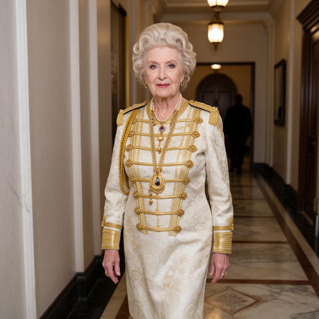 An older, regal woman in a luxurious, gold-accented outfit stands in a marble hallway, adorned with intricate jewelry and a unique, military-style white dress.