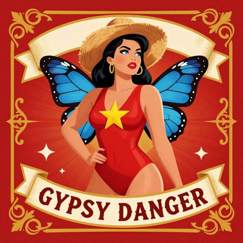 A vibrant retro-style illustration featuring a confident woman in a red bodysuit adorned with a yellow star emblem, complemented by blue butterfly wings and a straw hat, set against a bold red and gold ornate border, with the text \"GYPSY DANGER\" prominently displayed in a vintage banner.