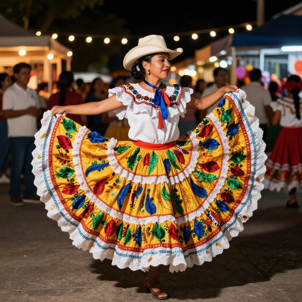 Dynamic scene featuring a persona mestiza dancing folkloric steps, vibrant swirling skirts, decorated with motifs representing mixed ancestry, lively market backdrop with festive lights