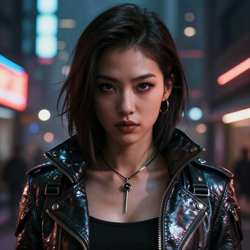 Mini skirt with knee high boots, cyberpunk city night scene, neon lights reflecting on wet pavement, edgy futuristic outfit, intense gaze, glowing accents, urban grunge atmosphere