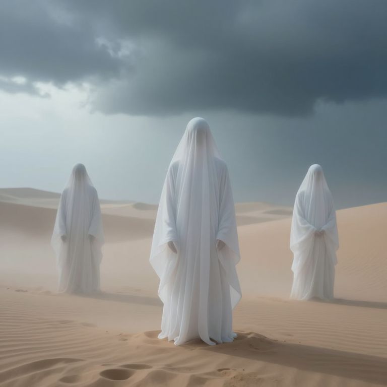 Veiled figures stand solemnly in the desolate expanse, their ethereal presence evoking a haunting blend of serenity and solitude, as if caught in an eternal vigil amidst the whispering sands and the weightless embrace of a storm-swept sky.