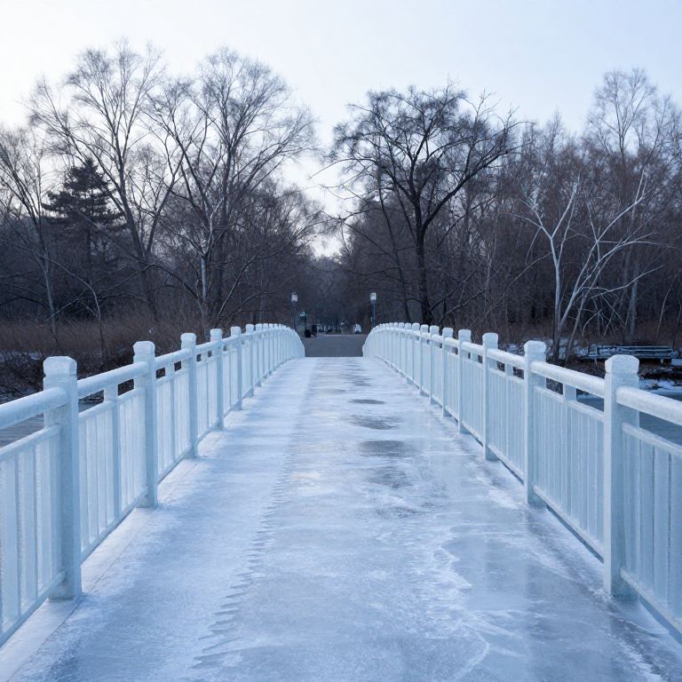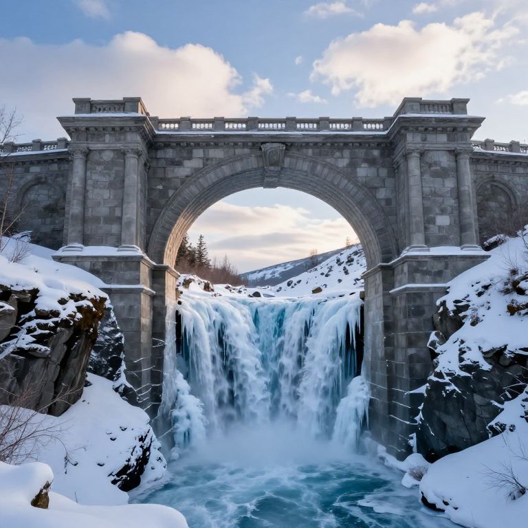 Suspended between the echoes of history and the whispers of tomorrow, this frozen bridge embodies the eternal quest for connection, its icy arches resonating with the silent tension of unmet destinies.