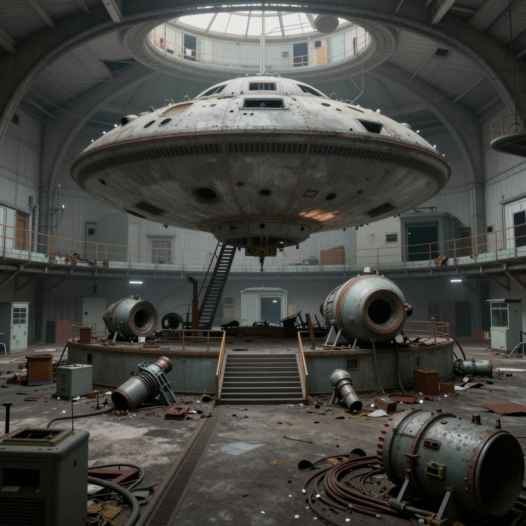 Interior of an abandoned Cold War era Soviet UFO repair service facility located in Kamchatka Peninsula. The room features a large, weathered UFO suspended in the center, surrounded by wrecked industrial equipment and machinery. The facility shows signs of decay with debris scattered on the floor, rusted metal surfaces, and aged control consoles. The circular, domed hall is lit by skylights above, emphasizing the eerie and desolate atmosphere.