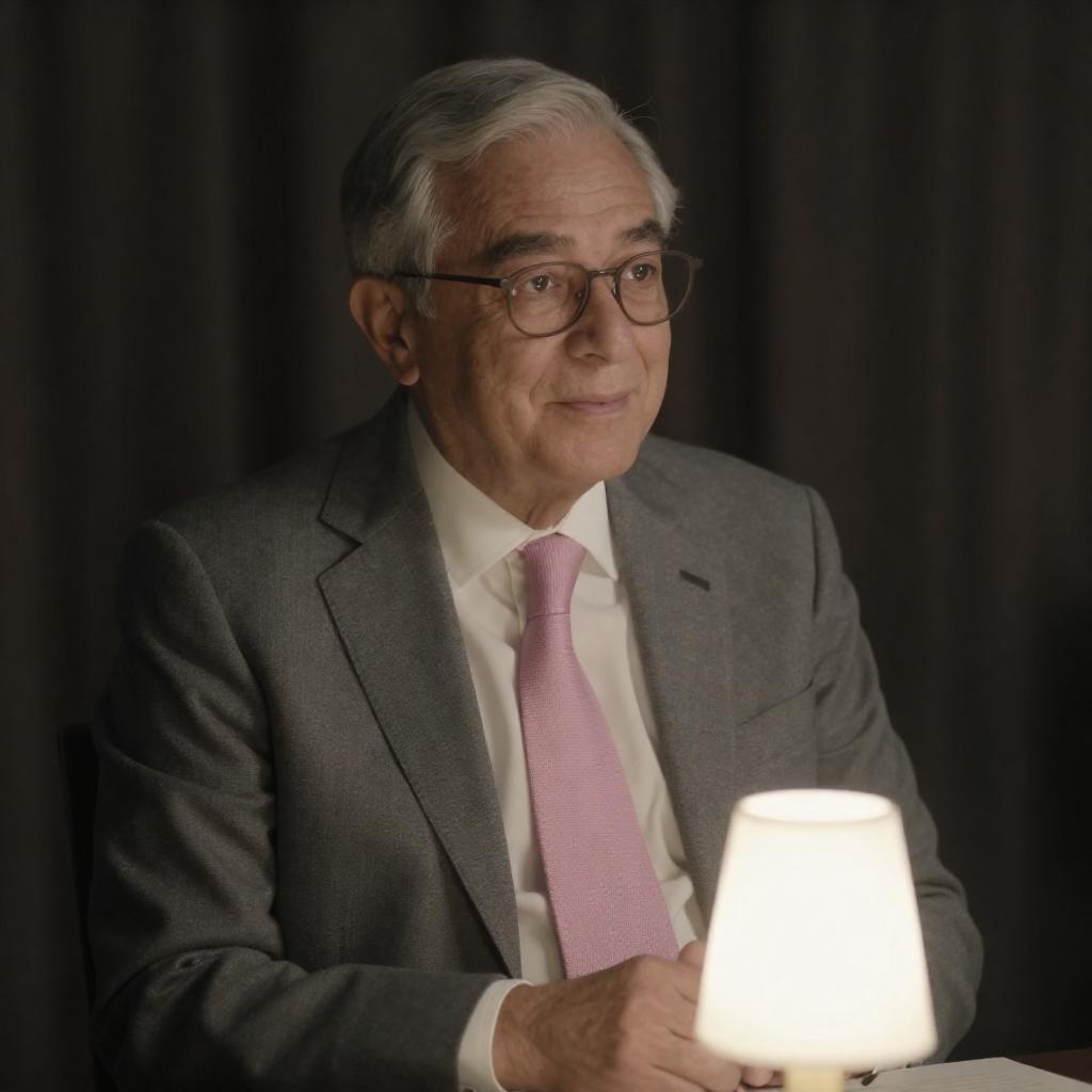 Photograph of an elderly man with thinning gray hair, wearing a gray suit, white shirt, and red-and-black striped tie, sitting at a desk with papers and a pen. He has a serious expression, looking slightly to the right. Background includes blurred bookshelves with framed photos. A dark silhouette of another person is in the foreground.