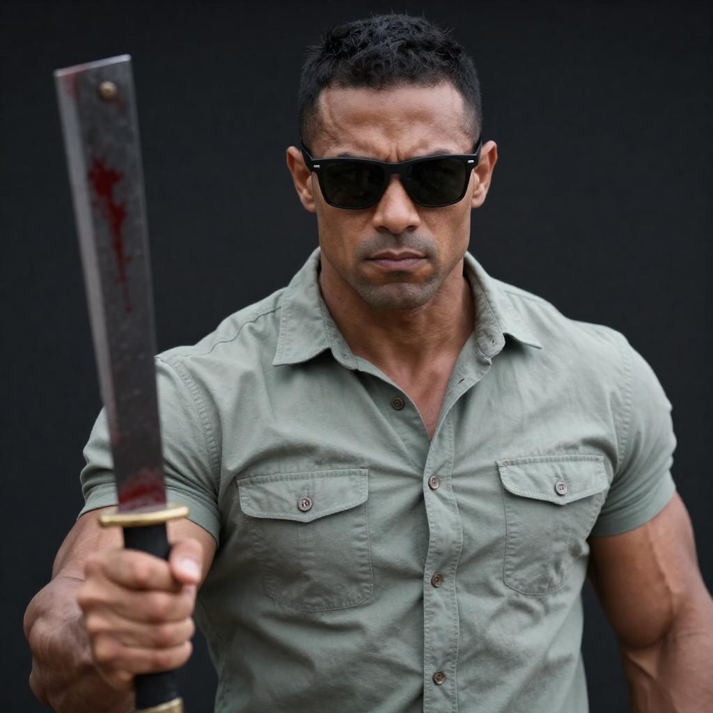Photograph of a muscular man with dark skin and short black hair, wearing black sunglasses and a light green button-up shirt. He is holding a blood-stained machete in his right hand, which is blurred in the foreground. The background is dark, emphasizing the man's intense expression and the machete's blood.