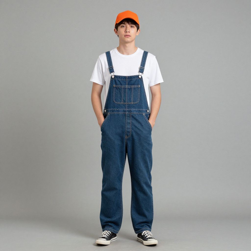 Photograph of a young man with fair skin, black hair, wearing an orange cap, white t-shirt, blue denim overalls, and black sneakers