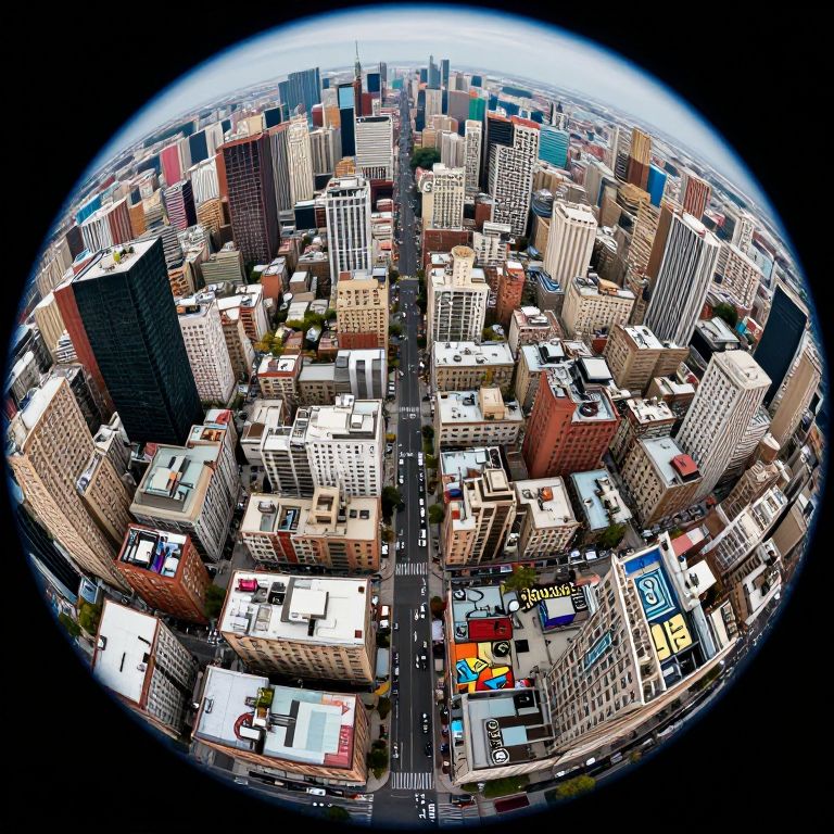 Fisheye Lens a cityscape, view from above, colorful, artful, intricated details, full of comic book references in the streets, 8k,