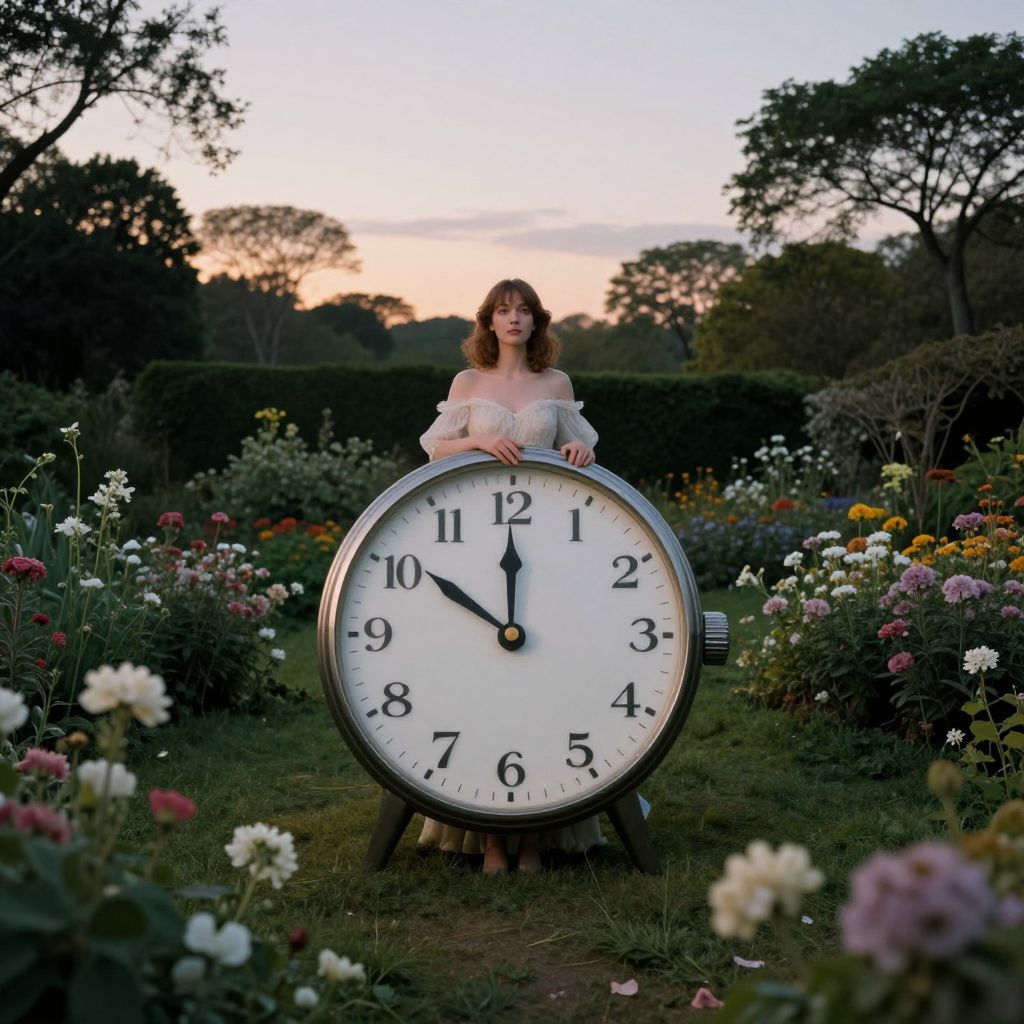 A photograph depicts a young woman with fair skin and shoulder-length brown hair, wearing an off-shoulder, white lace dress, standing behind a large, upright, vintage-style clock with black numbers and hands. The clock is centered in a lush, colorful garden filled with blooming flowers in various colors, including white, pink, and red. The sky in the background is a gradient of sunset colors, with trees silhouetted against the horizon. The woman's expression is serene, and she rests her hands on the clock's face. The image has a whimsical, fairy-tale-like quality.