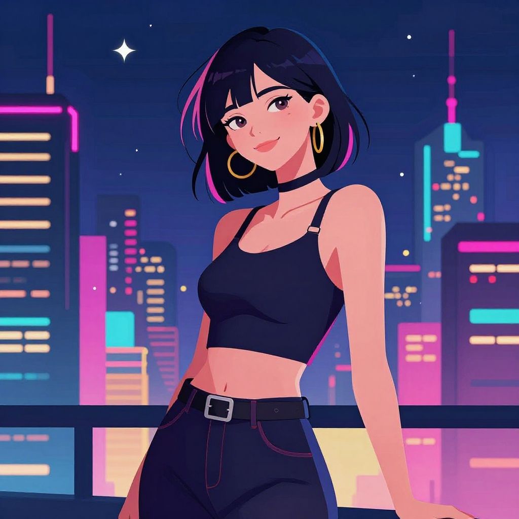 Masterpiece, best quality, 1girl, solo, night, colorful, cityscape, cyberpunk, light smile, city pop, vector illustration