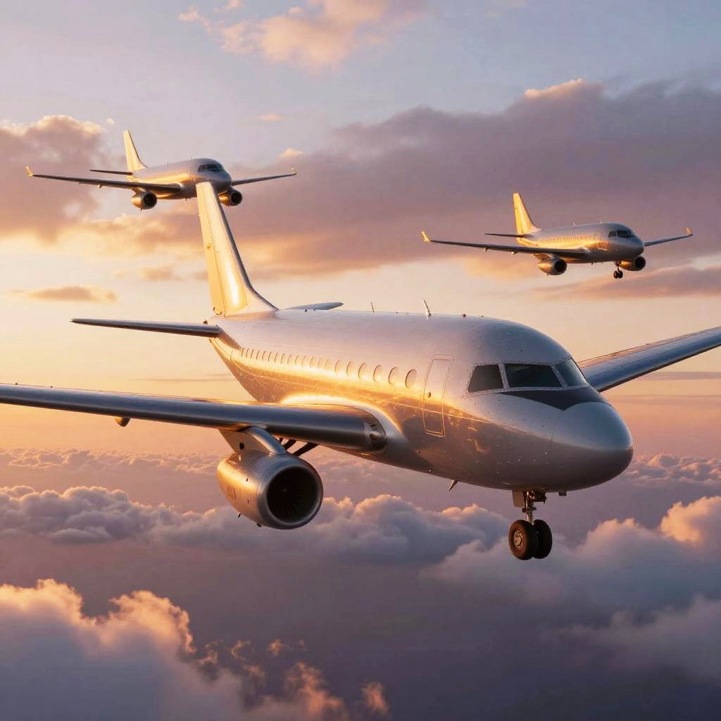 Anthropomorphic airplanes soaring through a vibrant sunset sky, featuring expressive eyes on cockpits, dynamic poses, and sleek metallic textures, with fluffy clouds below.