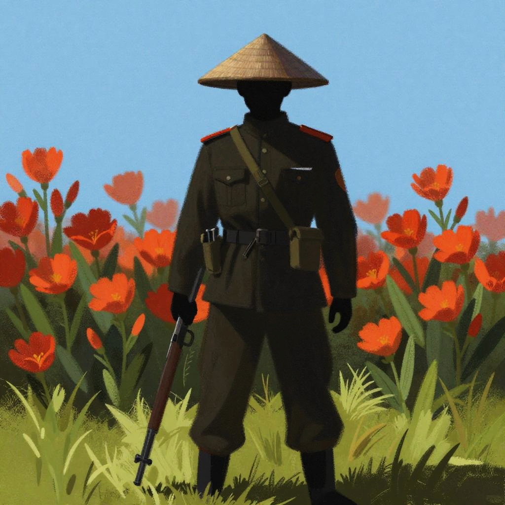 Digital drawing of a silhouetted figure in a conical hat and dark uniform, holding a rifle, standing amidst vibrant red-orange flowers with a clear blue sky above. The figure is partially shadowed, creating a striking contrast with the bright flowers in the foreground and background. The grass at the bottom adds a touch of green to the scene.