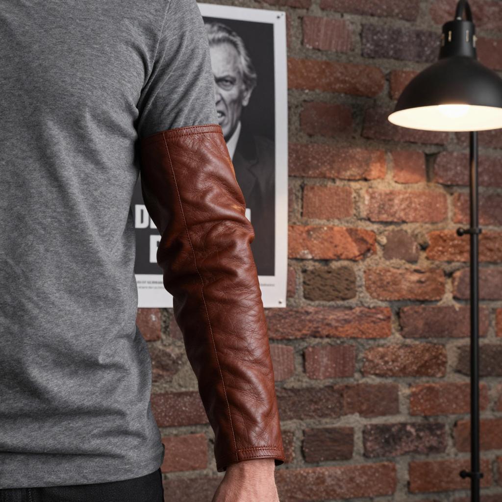 Man's arm in brown leather sleeve and gray shirt, standing in front of brick wall with poster of angry, older man. Lamp on right. Man's hand partially visible. Poster has black and white photo and . Brick wall has rough ure.