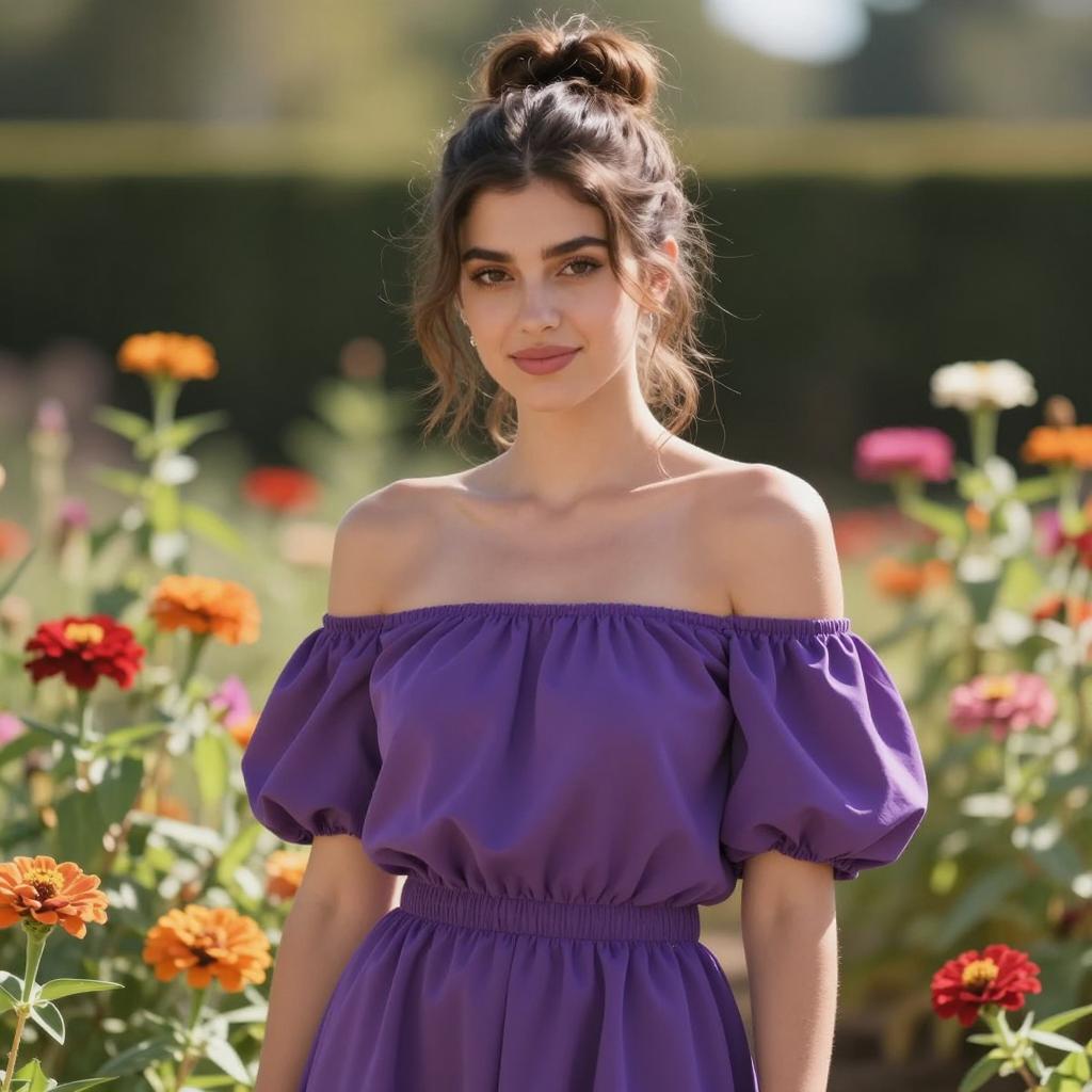 Navy satin prom dress, photograph of a beautiful young woman with long dark brown hair, wearing a strapless dark blue satin dress, standing in a garden with pink roses, sunlight, soft focus, romantic, elegant, daytime, natural light, outdoors, full body shot, side profile, slightly turned to face camera, gentle expression