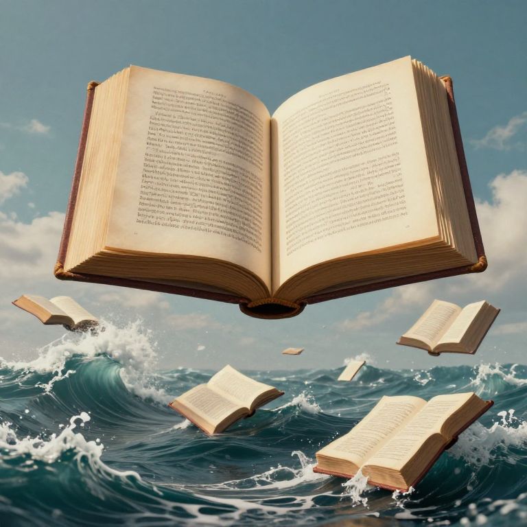 A surreal digital artwork depicts giant, open books hovering above turbulent ocean waves, symbolizing the interplay between knowledge and the untold stories beneath, rendered in a high-definition, dreamlike style with dramatic lighting and a vintage aesthetic.