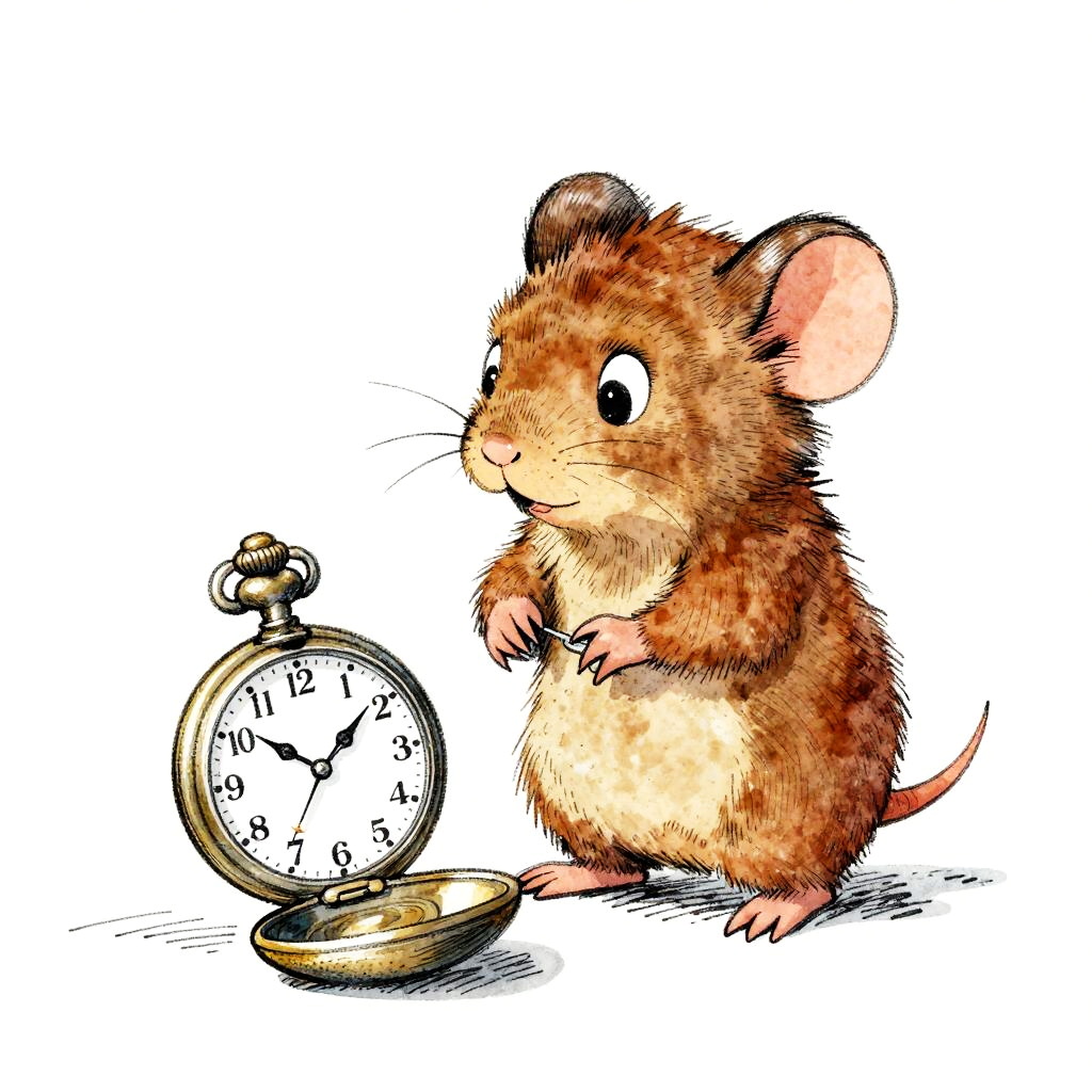 A whimsical illustration of a mole examining an old pocket watch, hand-drawn cartoon style; dynamic, expressive linework with varied thickness; soft watercolor washes over detailed ink outlines, textured brushstrokes; fine cross-hatching and stippling techniques; isolated on a white background.
