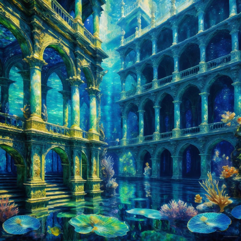 A detailed and dramatic illustration of a mermaid sitting gracefully on a rock inside an underwater palace. The scene features tall, ornate columns and arches with light filtering through the water, casting reflections. Colorful fish swim around coral reefs, enhancing the mystical oceanic atmosphere. The mermaid has long flowing hair, wearing a shimmering, scaled tail and an elegant headpiece, evoking a fantasy theme inspired by Monet.