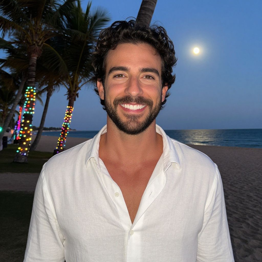 Photograph of a smiling man with dark, wavy hair and a beard, wearing a white, slightly open-collared shirt. He's standing in front of a beach at twilight, with palm trees decorated in colorful lights and a glowing moon over the ocean in the background. The scene is warm and inviting, with the man's bright smile contrasting against the darkening sky.