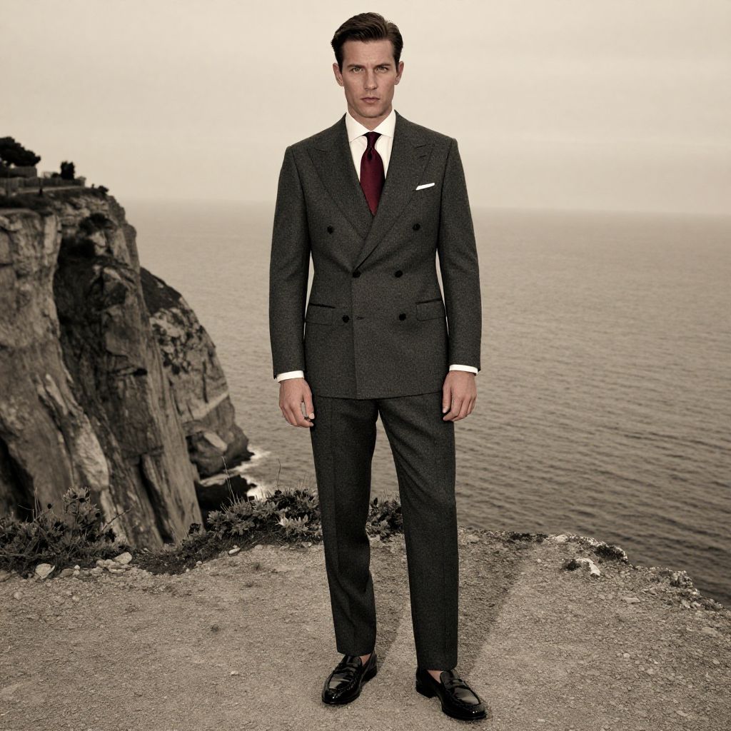 A man, charcoal gray wool tuxedo, double-breasted design, shawl collar, ivory silk dress shirt, deep burgundy silk tie, patent leather loafers, cliffside retreat, panoramic ocean view, sepia effect, confident expression. Man has masculine face and piercing eyes