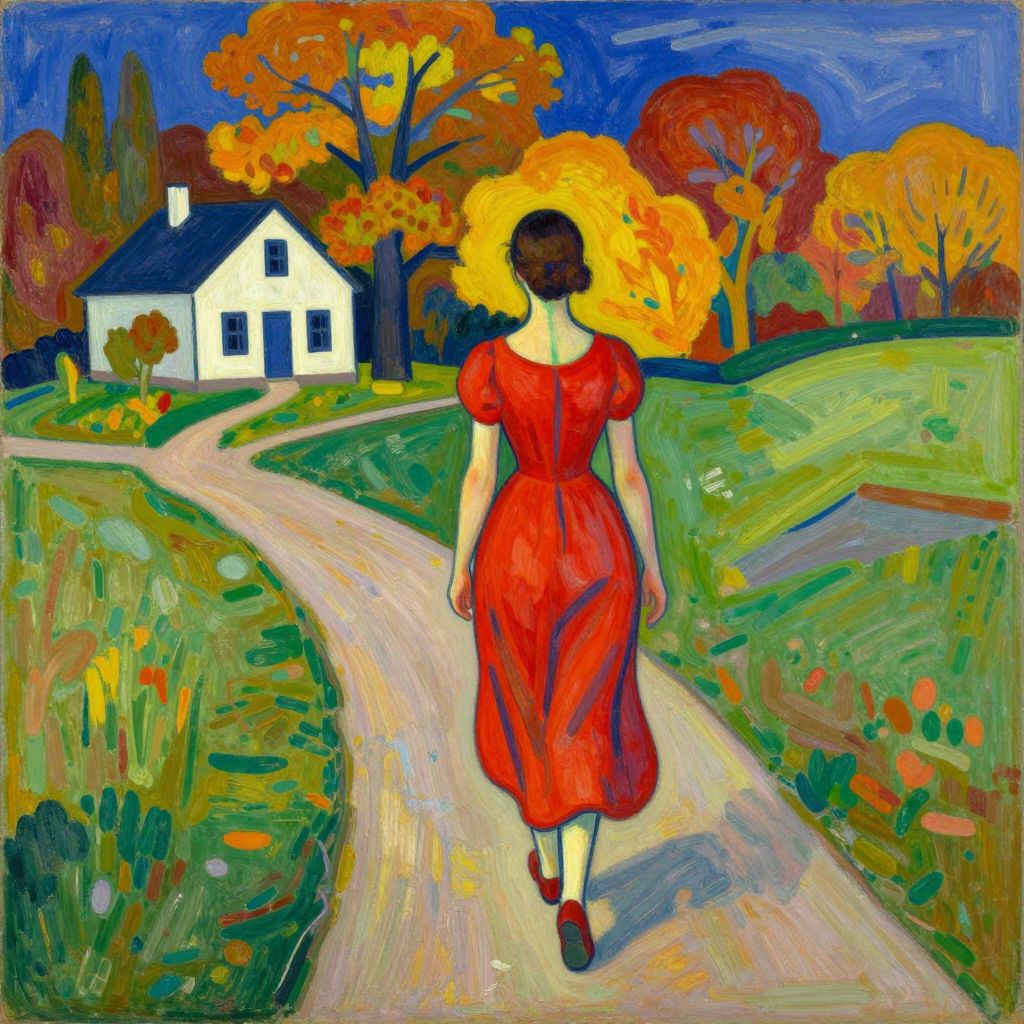 A vibrant digital illustration inspired by Gabriele Münter's style, depicting a woman in a red dress walking along a winding path toward a quaint house amidst a colorful autumn landscape, rendered with bold colors and simplified forms characteristic of early 20th-century Expressionist art.