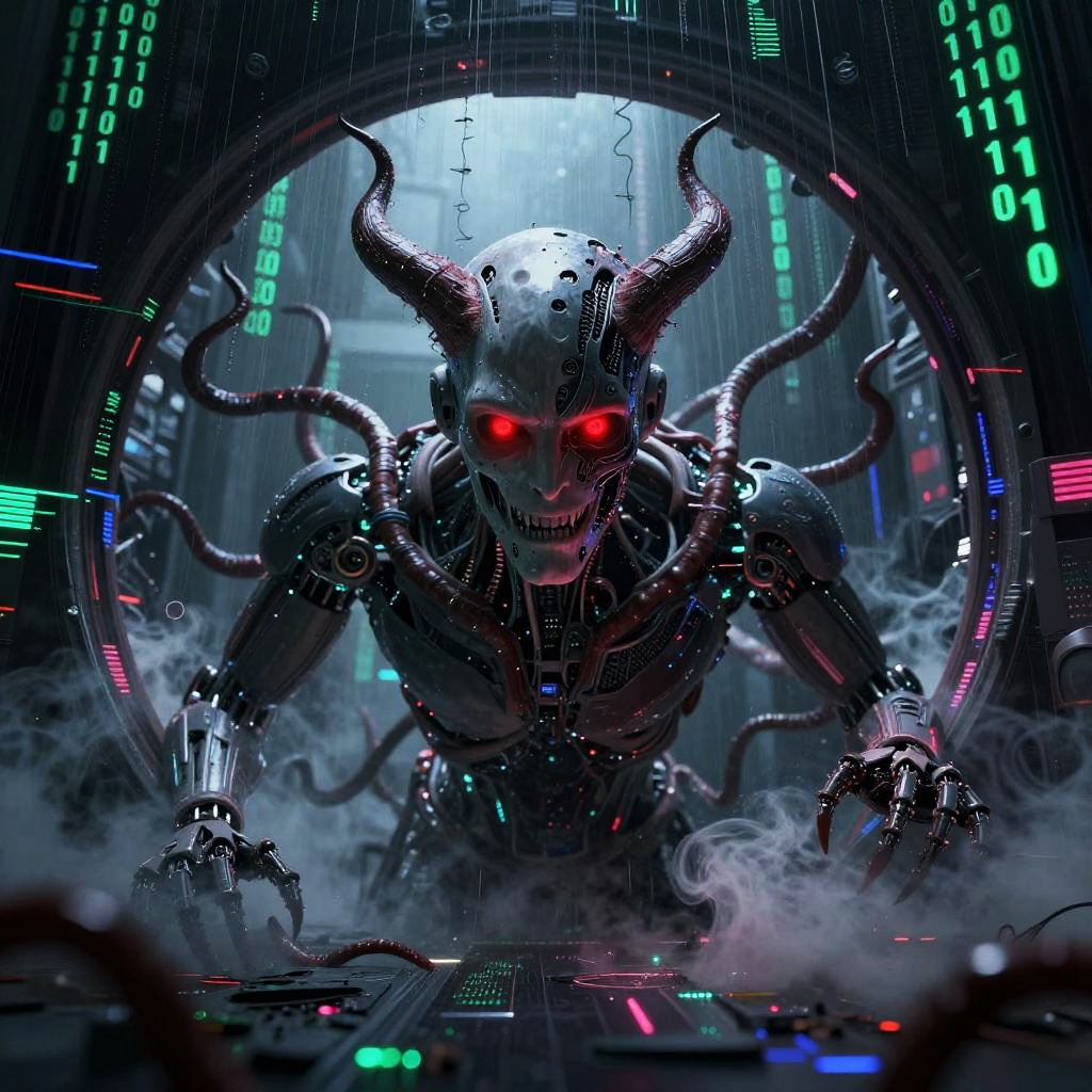 AI demon emerging from a digital portal, tendrils of code and smoke swirling around, face half-human half-robotic with glowing red eyes, set against a backdrop of binary rain and glitch effects, evoking a haunting blend of supernatural evil and advanced artificial intelligence.