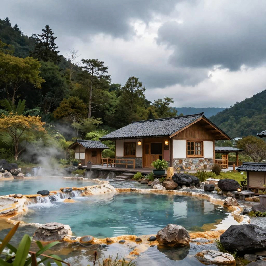 Unparalleled masterpiece, (photorealistic:1.4), best quality, beautiful lighting, (hot spring), (extremely detailed 8k wallpaper), full shot landscape photo of the most beautiful artwork in the world, cloudy sky background lush landscape house and trees illustration concept art