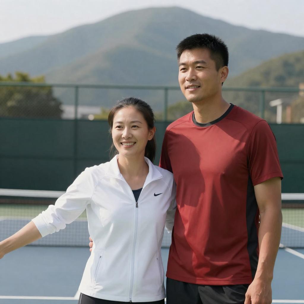 Photograph of two people on a grassy golf course. One man stands holding a golf club, wearing a white shirt, blue jeans, and white sneakers. Another person, in a white dress and sunglasses, sits on the grass in a stretching pose. Clear blue sky, distant rocky hill, and ocean in the background. Man stands to the left, person in dress on the right.