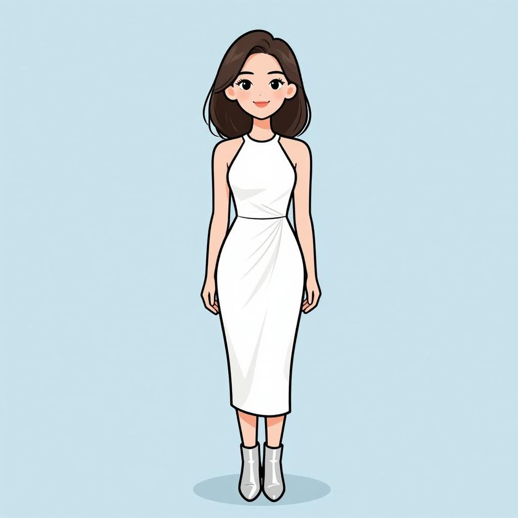 Digital drawing of a smiling Asian woman with straight brown hair, wearing a white sleeveless dress with a brown belt, and white sneakers, standing in a