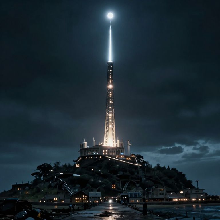 Nighttime photograph of a tall illuminated tower with a bright blue light at the top, standing on a dark, cloudy hill.