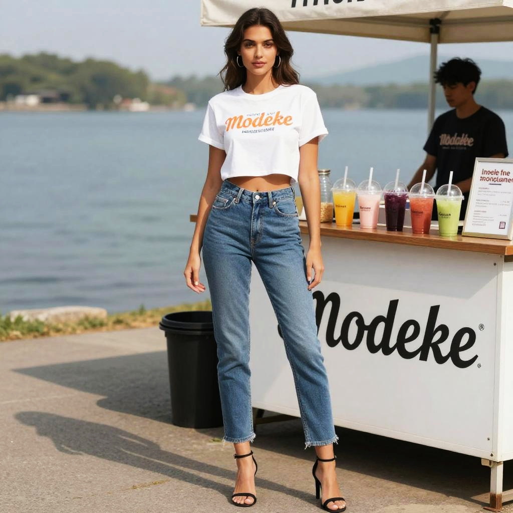 A lean woman in casual streetwear, wearing a cropped graphic t-shirt in white with orange and black text and high-waisted blue denim jeans, stands at a smoothie stand by a lake. She completes her look with black open-toe heels featuring an ankle strap. Visual style: a1 pictures. Sexy. Pretty face and beutiful eyes