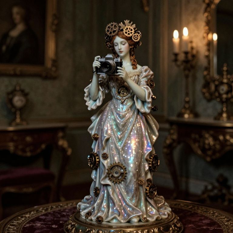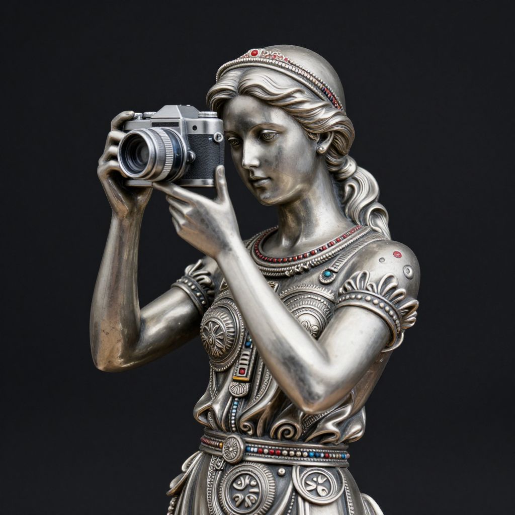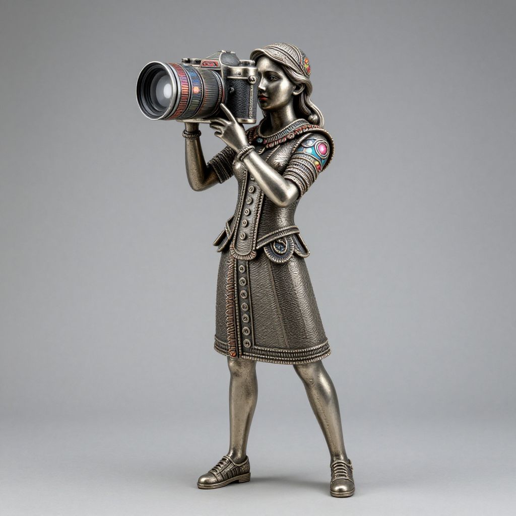 The image depicts a striking, full-body sculpture of a woman holding a large, ornate camera. The sculpture is rendered in a metallic, silver finish with intricate details and vibrant colors that create a sense of depth and realism. The woman's body is adorned with a series of buttons and a textured skirt, adding to the complexity of the design. The camera she holds is equally detailed, with a large lens and decorative elements that suggest a vintage or antique style. The sculpture is positioned against a plain background, which accentuates the figure and the camera, making them the focal points of the composition. The interplay of light and shadow on the sculpture highlights its three-dimensional form and the intricate textures, creating a dynamic and visually engaging piece. The overall composition is balanced, with the woman and the camera aligned in a way that draws the viewer's eye across the entire sculpture.