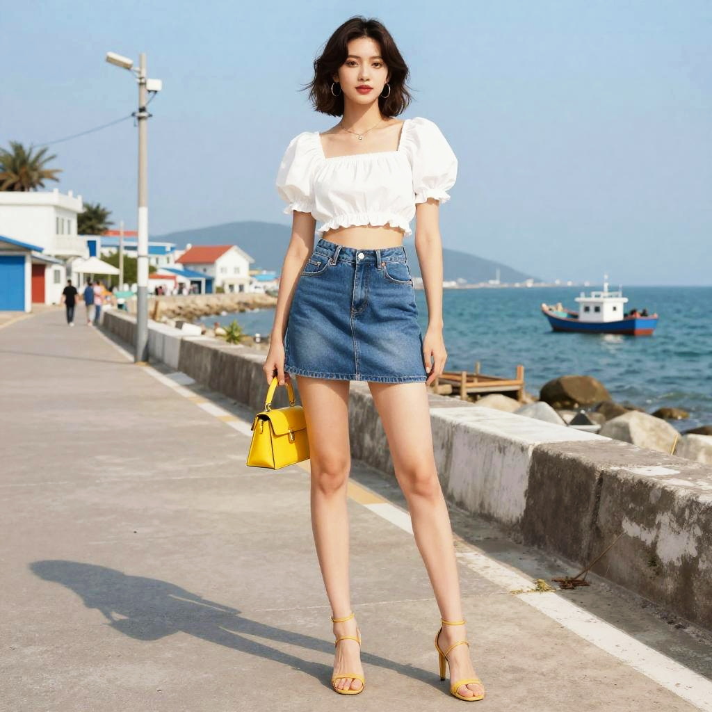 A woman, modern feminine style in a white sleeveless mini dress with abstract brown spots, flared skirt, and nude strappy heels, sitting on a seaside boardwalk bench at sunrise, minimalist tan shoulder bag by her side, bare arms and casual hairstyle, in the visual style of Shueisha. Sexy. Pretty face and beutiful eyes