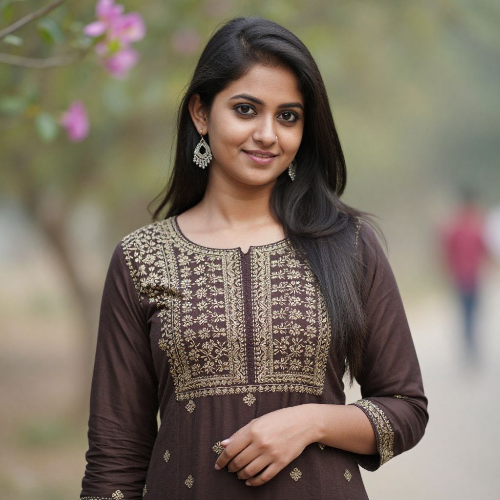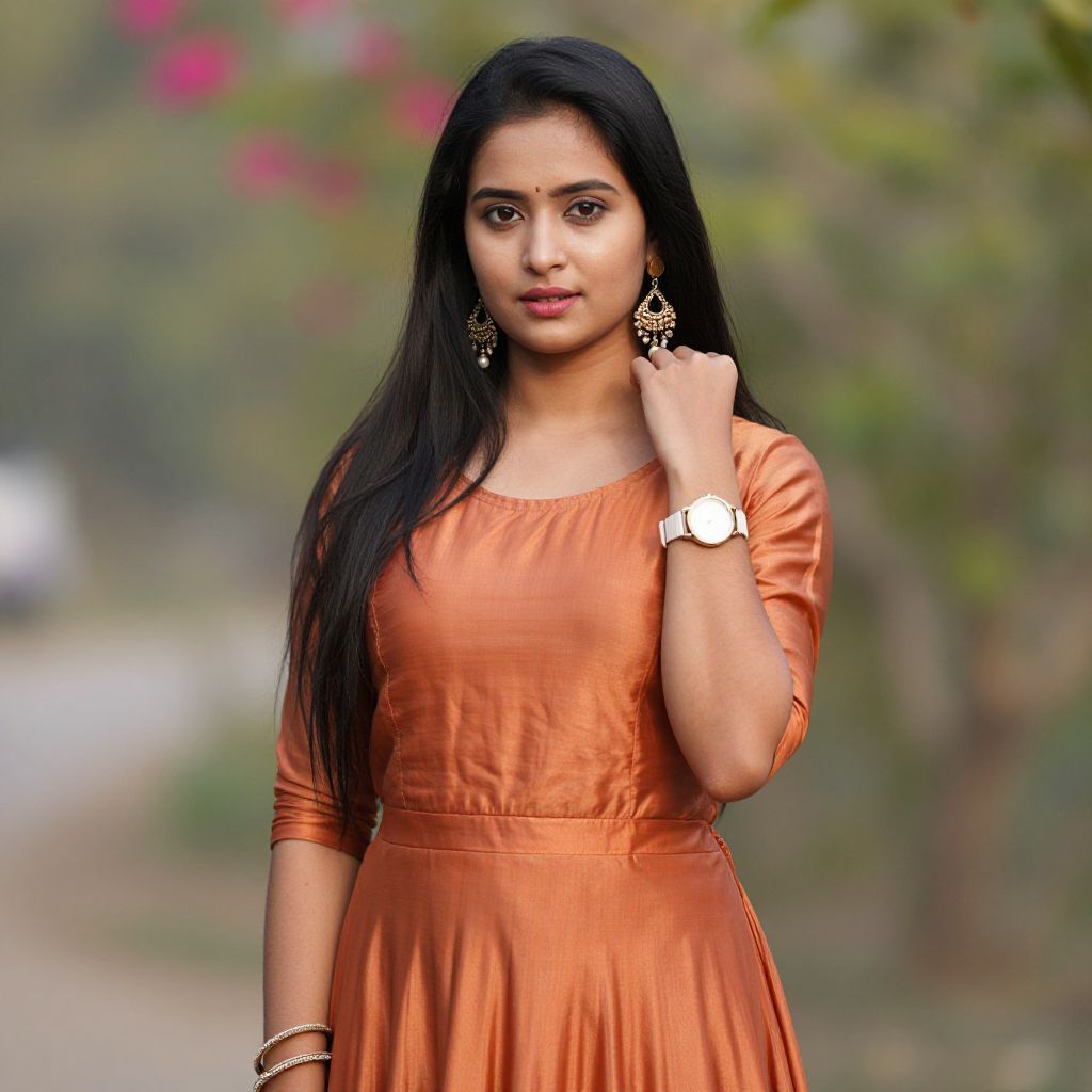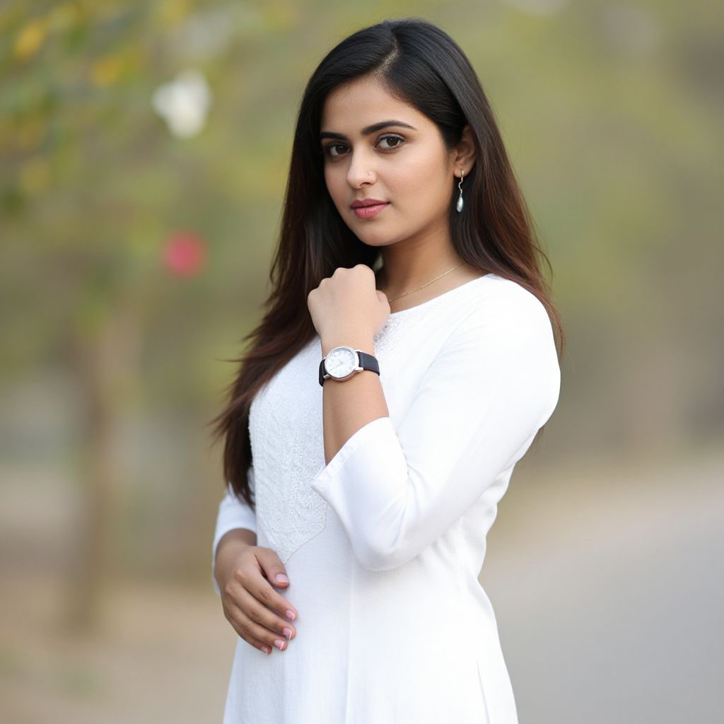 "afghani salwar kurti, 1girl, solo, long hair, dress, outdoors, flower, watch, white dress, realistic, looking at viewer, black hair, blurry, jewelry, blurry background, wristwatch, brown hair, standing Realistic photo of casual sexy person with pretty face"