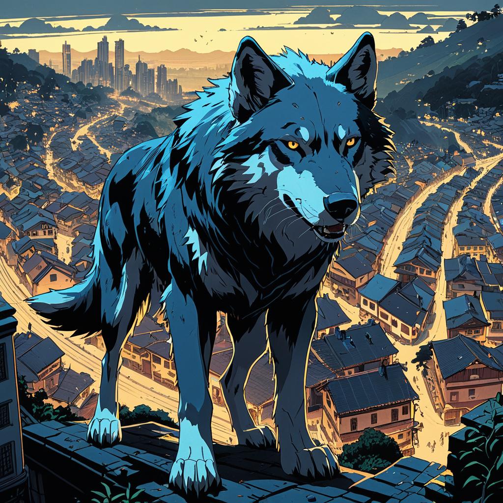 Digital artwork depicting a giant magical wolf standing over the historic city of Ouro Preto, Minas Gerais. The image features detailed rooftops and streets illuminated by warm lighting with a distant skyline under a moody sky. The wolf is rendered in bold blue shades with intense amber eyes, evoking a sense of fantasy and mysticism. The scene combines elements inspired by artists Tomer Hanuka, Makoto Shinkai, and Thomas Kinkade, showcasing a matte painting style with high detail and vibrant contrasts.