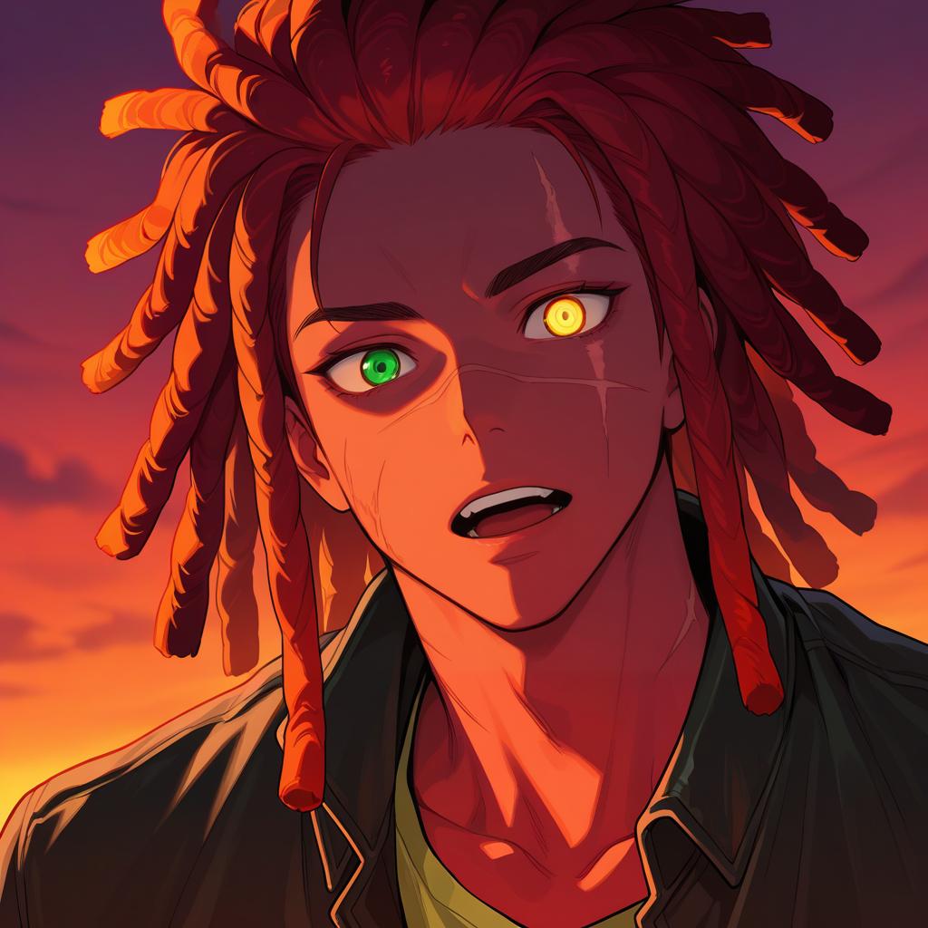 Portrait, 1boy, solo, male focus, slender youth with fiery red dreadlocks, heterochromatic eyes one green and one yellow, narrow jawline, open mouth, scar on face, stitches, blood, colored skin, anatomical details, looking at viewer, busy crimson sunset sky