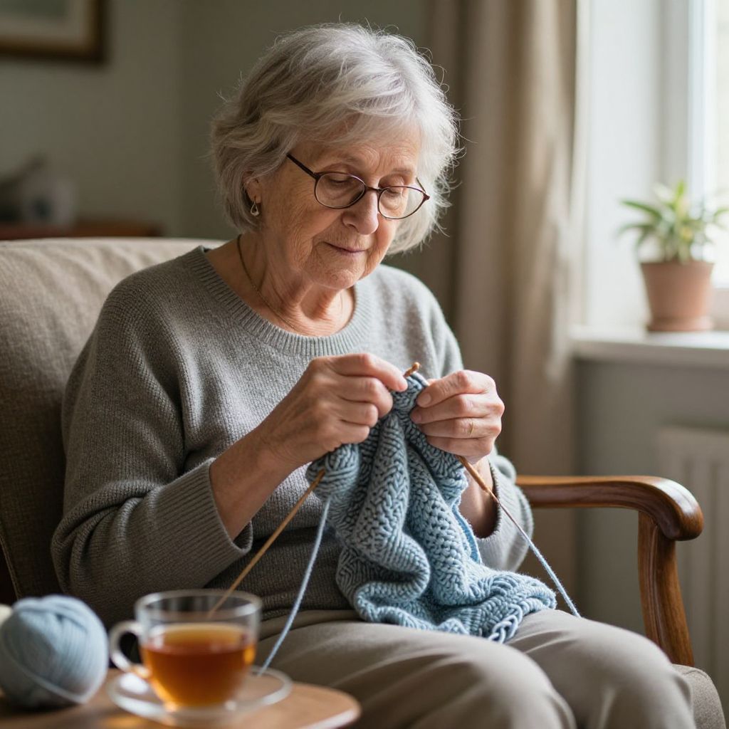 In a quiet corner bathed in soft sunlight, a serene elderly woman knits with graceful hands, her gentle movements weaving not just yarn but threads of memory, warmth, and timeless wisdom, as the scent of freshly brewed tea lingers in the air.