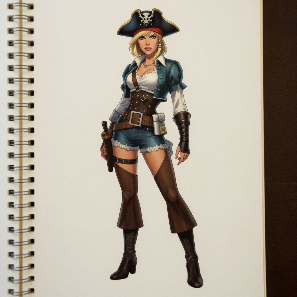 This is a digital drawing of a blonde woman dressed as a pirate. She wears a black tricorn hat with a white skull emblem, a blue jacket with white sleeves, and a white shirt with a deep neckline. Her denim shorts are frayed at the edges, and she has black thigh-high boots with brown leg warmers. She has a brown belt with a large buckle and a holstered pistol on her right hip. Her gloves are black, and she stands confidently against a white background with a spiral notebook on the left. The style is colorful and detailed, typical of comic book art.
