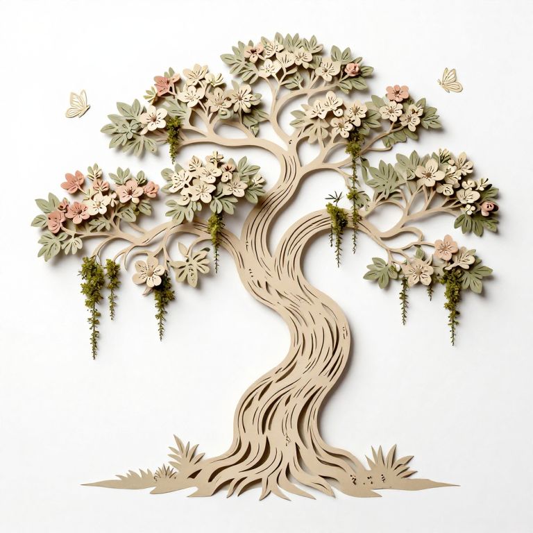 Elegant, intricately cut paper tree with flowing trunk, adorned with white and pink flowers, green leaves, and hanging moss. Digital artwork.