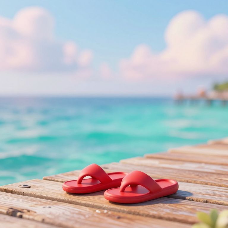 Photograph of red flip-flops on a wooden boardwalk, with a blurred turquoise ocean and bright blue sky in the background.