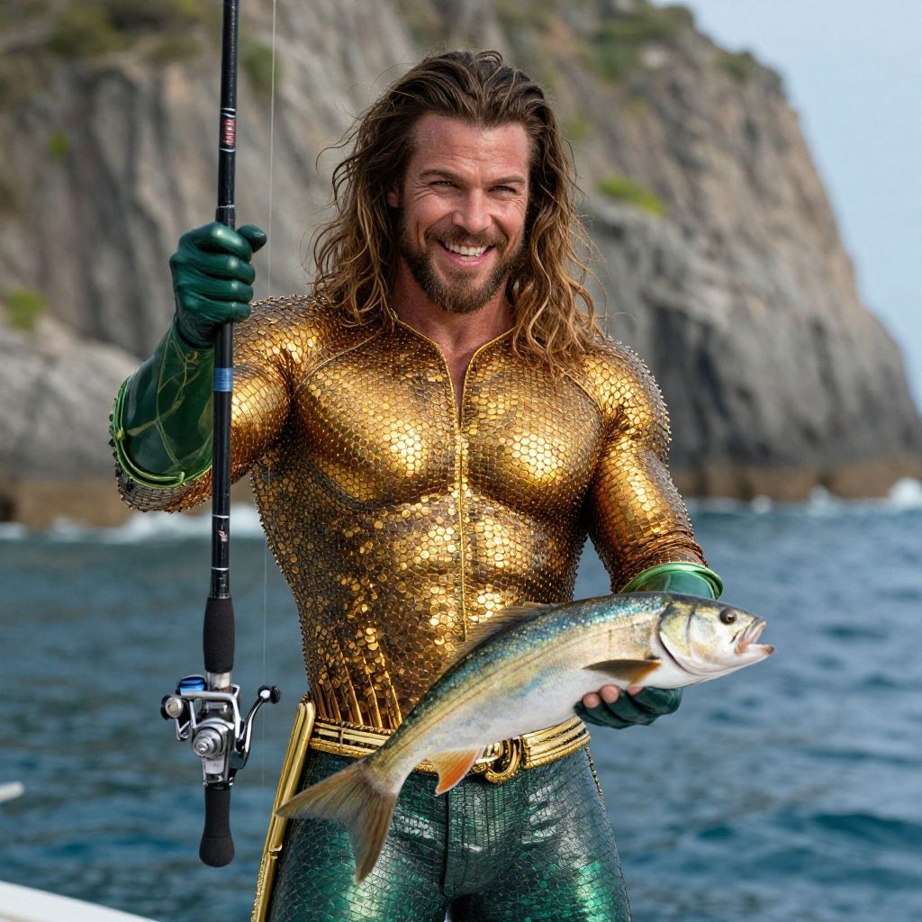 Happy smiling Aquaman fisherman, catching fish, fishing with a fishing rod, equipment, colored, beautiful image, masterpiece, beautiful scenery, realistic, movie scene