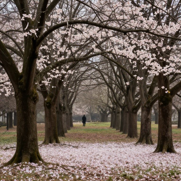 Photograph of a serene park scene featuring a row of tall, dark brown trees with abundant pink cherry blossoms in full bloom. The ground is carpeted with fallen pink petals. A solitary figure, dressed in dark clothing, walks away from the camera in the background, creating a sense of depth. The sky is overcast, and the light is soft, enhancing the gentle, tranquil atmosphere. The trees form a natural canopy overhead, their branches intertwined. The image captures the beauty of spring with its delicate, pastel colors and peaceful setting.