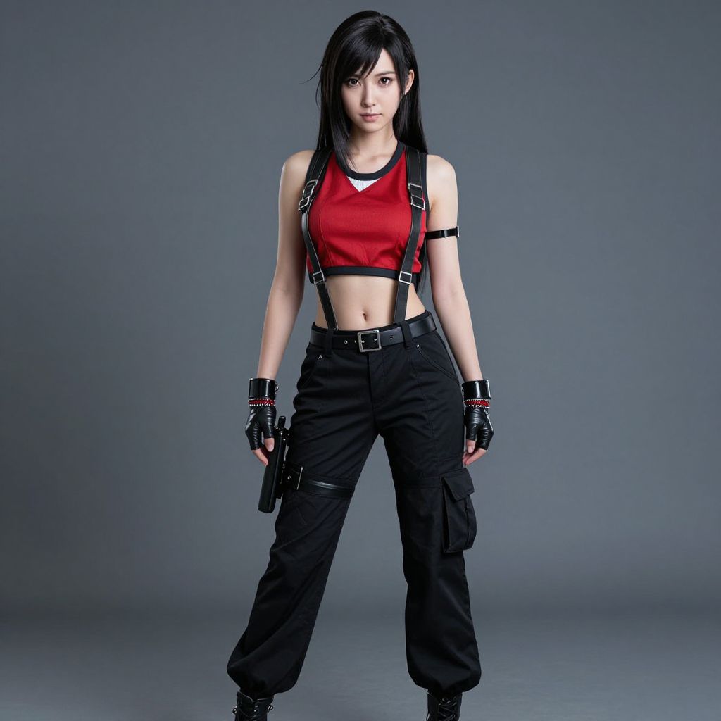 Final Fantasy Tifa Costume, woman in a red top and black pants posing for a picture
