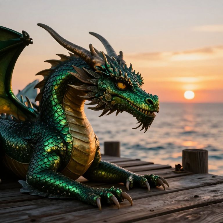 Envision a detailed close-up portrait of an enigmatic dragon, reminiscent of intricate Palencar-inspired illustrations, resting on an aged wooden dock during sunset. From an elevated viewpoint, observe its captivating emerald scales glimmering under the radiant golden light as it looks towards the distant horizon. The dragon's intense eyes mirror the transitioning sky and ocean hues, instilling both wonder and respect in the viewer while emanating a sense of primordial knowledge and unbridled might. This image harmoniously merges serenity with its regal demeanor, enticing spectators to appreciate the subtle equilibrium between natural splendor and legendary lore.