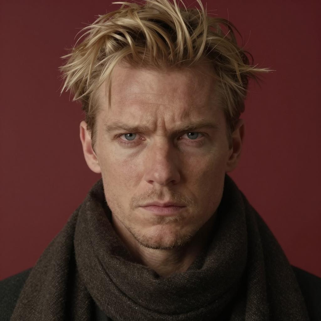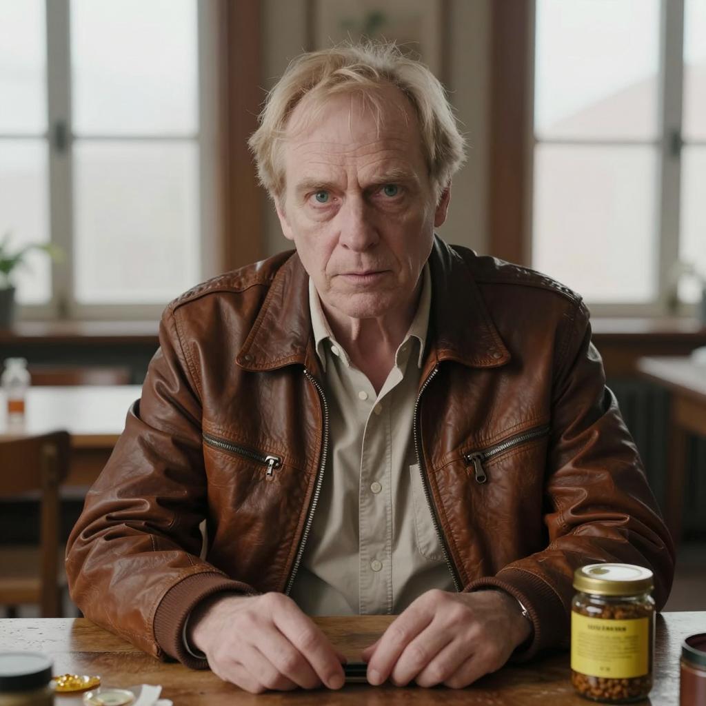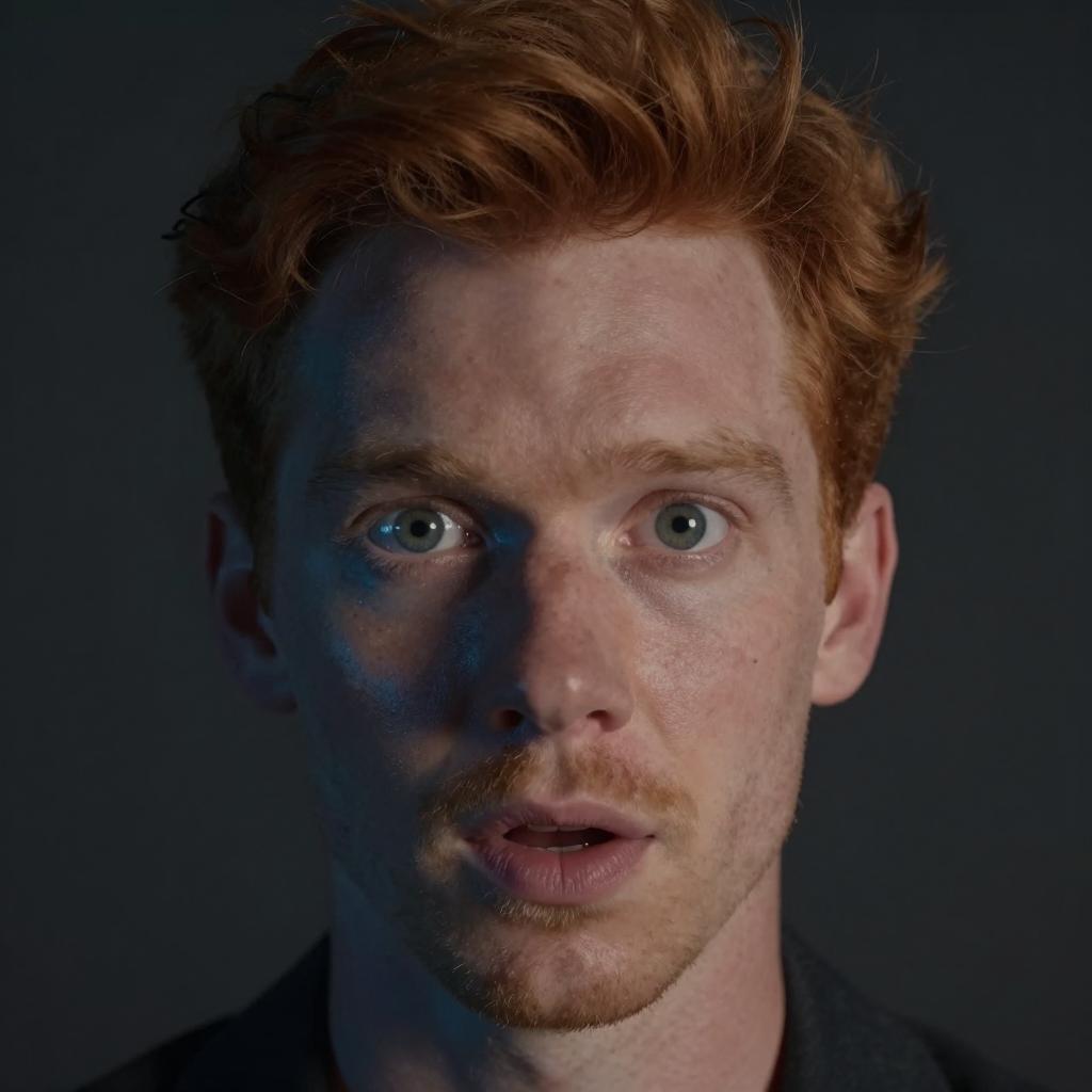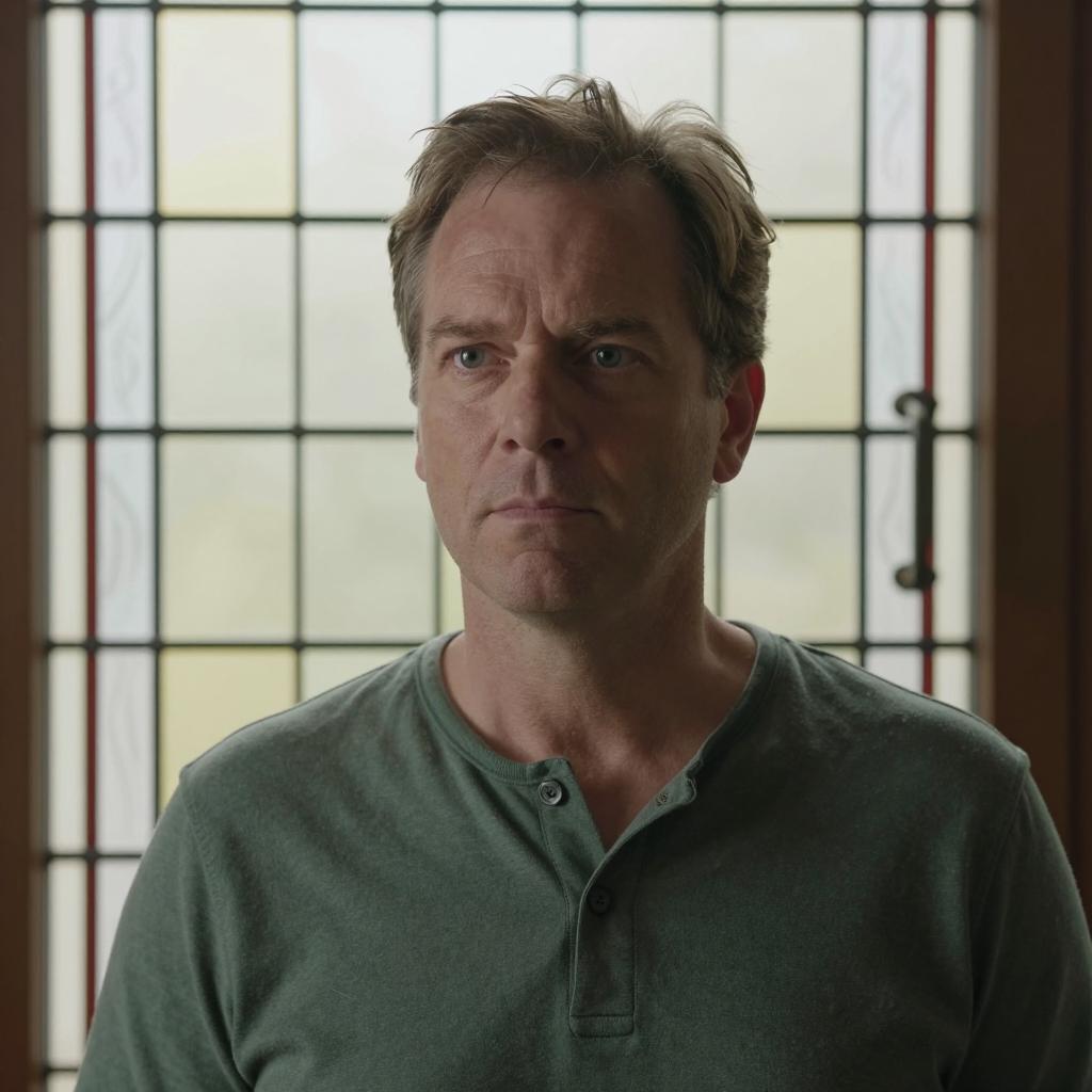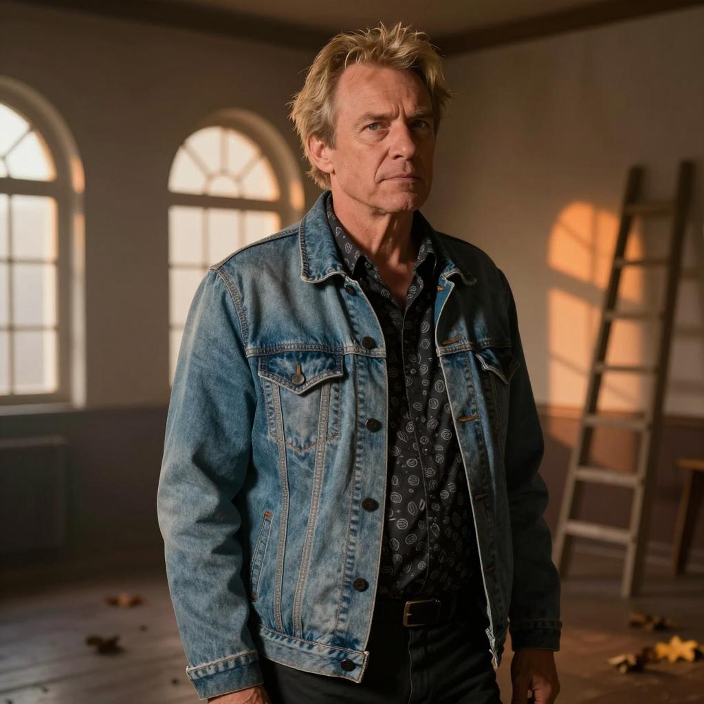 Middle-aged man with red hair, wearing a green jacket and brown shirt, crouching and holding a microphone. Background includes a Christmas tree on the right and a pink abstract painting on the wall. Dark indoor setting. Man smiles slightly. Two people partially visible in foreground. Soft lighting.