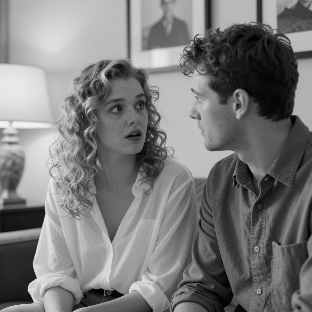 Photograph of a young couple in a dimly lit room. Woman with light skin, blonde hair in a bun, wearing a red dress with white floral patterns, looking up at the man. Man with light skin, dark brown hair, wearing a white shirt with gray suspenders, looking down at her, hand on her shoulder. Both have intense, focused expressions. Dark background.
