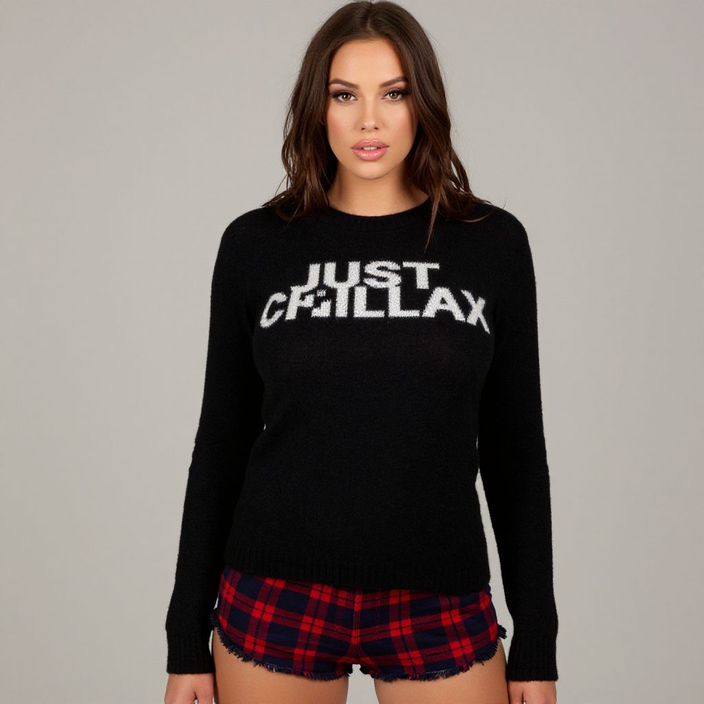 "Woman, casual, black cropped tank top with hashtag text, distressed denim shorts, high waist, frayed hems, round oversized sunglasses.. Sexy. Pretty face and beаutiful eyes. Big breasts."