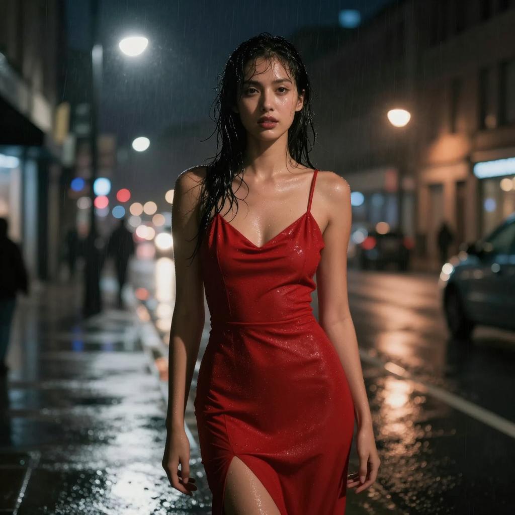 A woman wearing a red dress stands confidently in a rainy urban street at night, surrounded by soft glowing street lamps and blurred city lights, cinematic moody atmosphere, high contrast with deep shadows highlighting the rain and dark skin, dramatic lighting emphasizing the texture of the dress and wet skin, wet hair with a stylish pose, nighttime city background with glowing street lamps and rainy ambiance