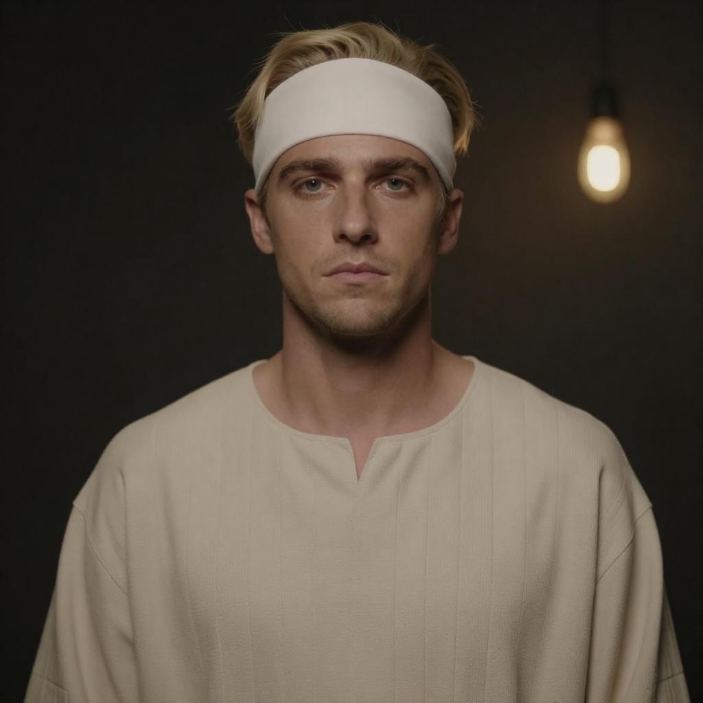 Photograph of a blonde man with a white headband, staring forward with intense eyes, wearing a beige, pleated tunic. Dark background with a small, glowing light on the right. Man's face illuminated, shadows on the sides. Upper body only visible.