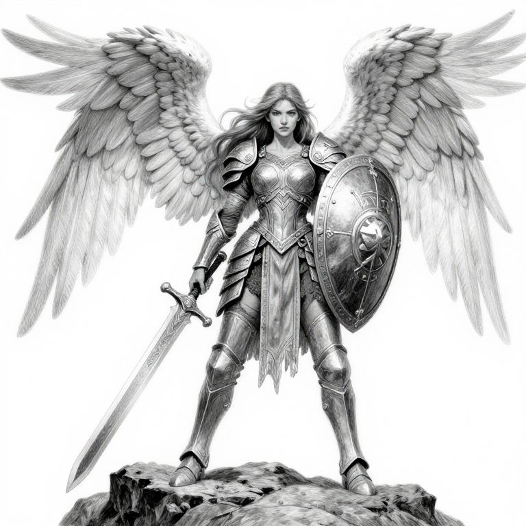 Female warrior angel drawing, heroic stance on a rocky cliff, long flowing hair and large angelic wings, holding a massive shield and sword, battle-worn armor detailed with engravings, monochromatic pencil drawing style with detailed textures and expressive eyes