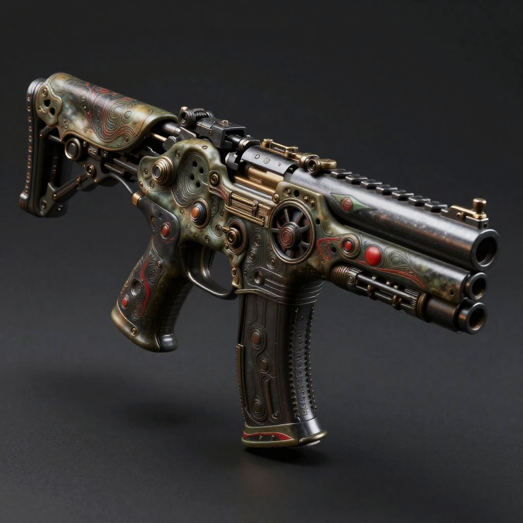 AI generated gun combining organic and mechanical elements, biomechanical style with intricate patterns, dark muted colors with red highlights, sci-fi fantasy atmosphere, detailed textures, dramatic lighting effects.